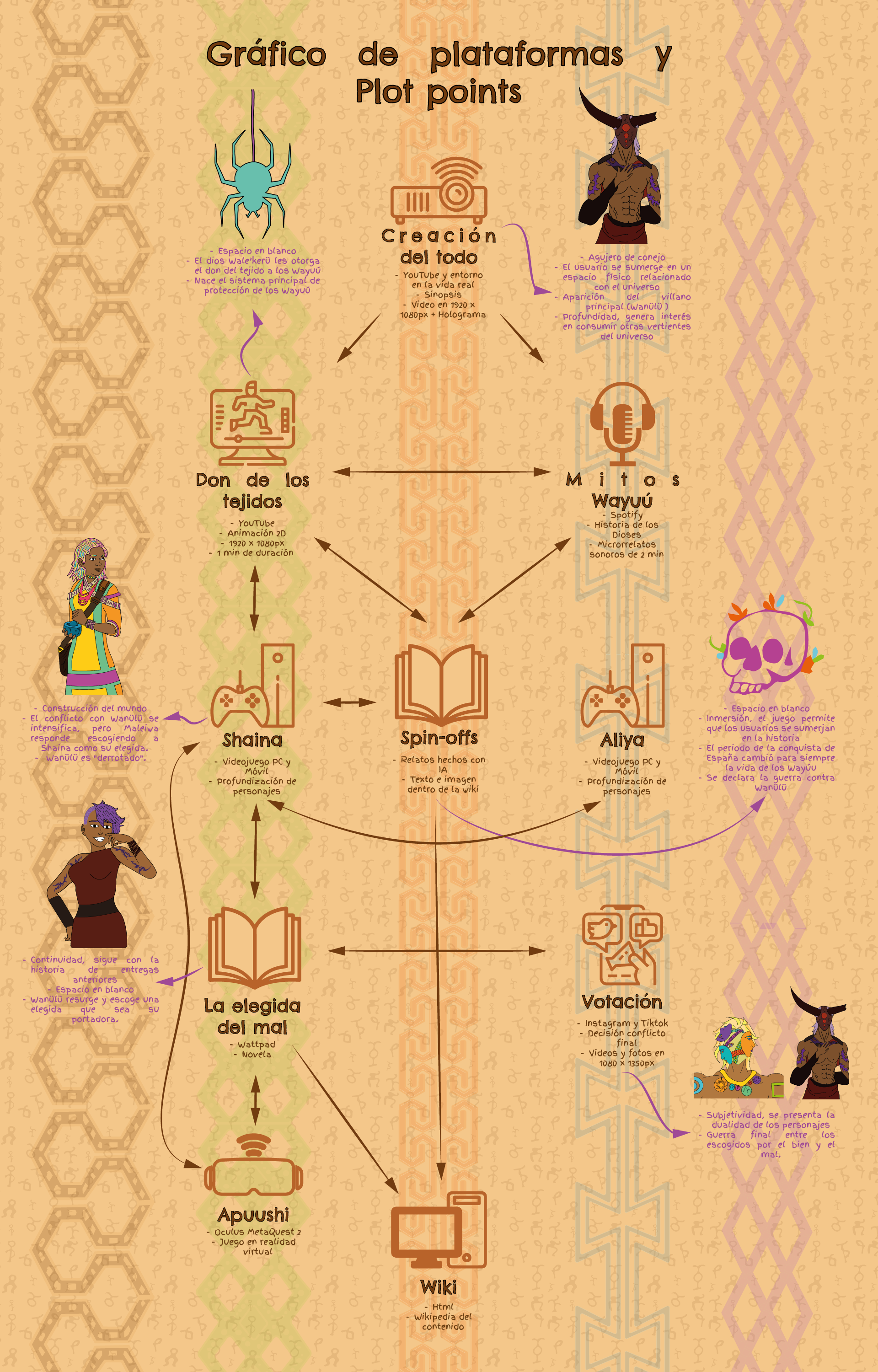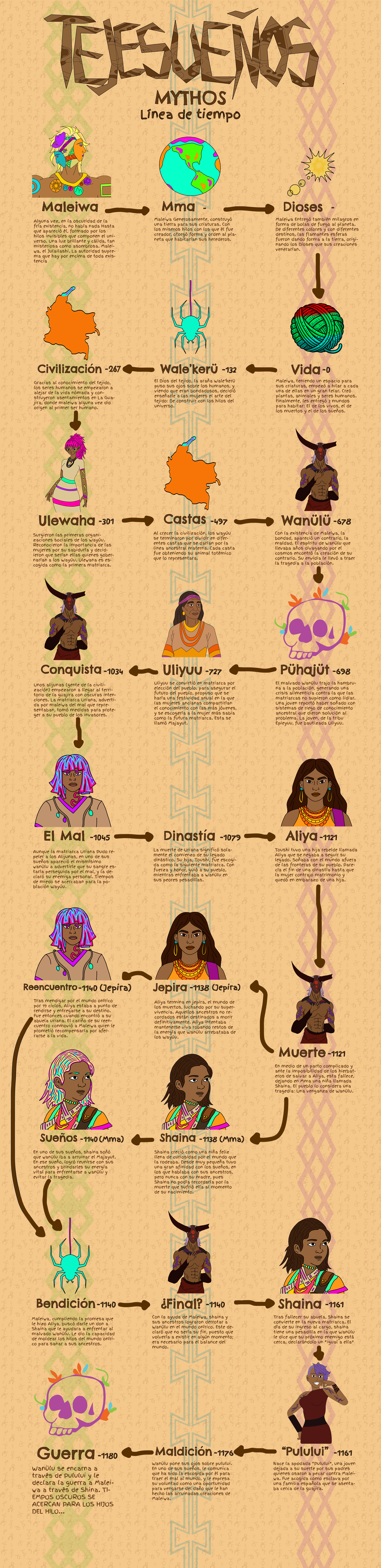 Desde el nacimiento hasta la muerte, los Wayúu atraviesan los cambios de la vida en un camino que parece avanzar sin retorno. Pero la historia de su pueblo, reflejada en la línea del tiempo, muestra que este flujo no es siempre estable. En sus primeras épocas, cuando Mma era joven, el mundo era puro y Maleiwa tejió a los humanos con hilos sagrados. Con el paso de los siglos, el equilibrio se rompió con la llegada de Wanülu, la encarnación del mal, y la guerra alteró la conexión entre los vivos y sus ancestros. El caos no solo trajo sufrimiento, sino que debilitó la energía onírica que mantenía vivos los lazos entre los mundos.